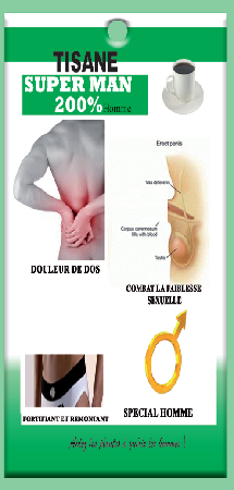 Tisane faite à base d'eau minéral, pure de godji, plantes Africaines, fruits Asiatiques. Indcation : Faiblesse sexuelle, impuissance, azoospermie, sperme fluide,